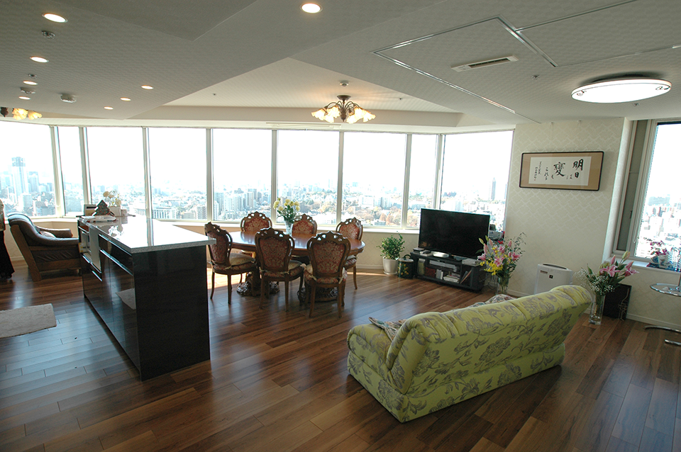 眺めの良い景色は、タワーマンションの一番の魅力です。その魅力を最大限に引き出すために、窓のある部屋をすべてつなげて、パノラマビューのリビングをつくりました。日本の四季や夕焼け、富士山などが一望できる眺めは、毎日でも見とれるほど美しく、心が癒されます。